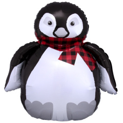 Шарик в форме пингвина с красно-черным клетчатым шарфом. Рекомендуется наполнять гелием. Имеет встроенный клапан, что упрощает надувание. Тонкая миларовая (фольга на полиэтиленовой основе) пленка позволяет шарам не сдуваться от недели до одного месяца. Размер шара в надутом виде 28"/71см ш x 27"/68см